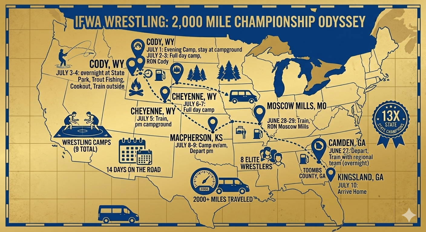 This summer, the wrestlers of IFWA have been handed a rare opportunity. We aren't just going to practice; we are embarking on a 14-day, cross-country intensive training tour. We will be traveling alongside the 13X State Champion Camden High School wrestling team, moving from the heat of Georgia to the high altitudes of Wyoming.